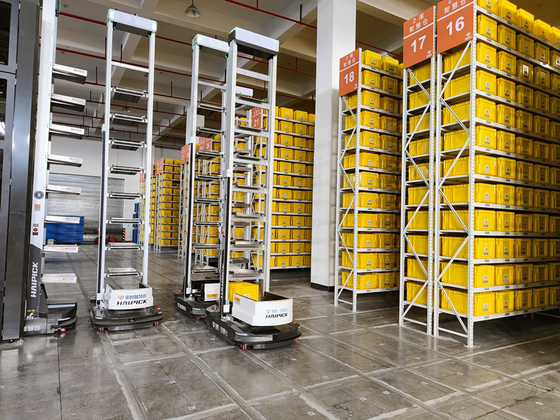 在宝时智能仓,商品的拣选不再是人推着货架,拿着单子去拣货,而是等着机器人驼着货架排队跑过来,通过AGV机器人搬运箱子实现“货到人”拣选,打破了传统的“人到货”的拣选模式。拣选人、机器人、货架一切井然有序,形成了一种别样的和谐场景。